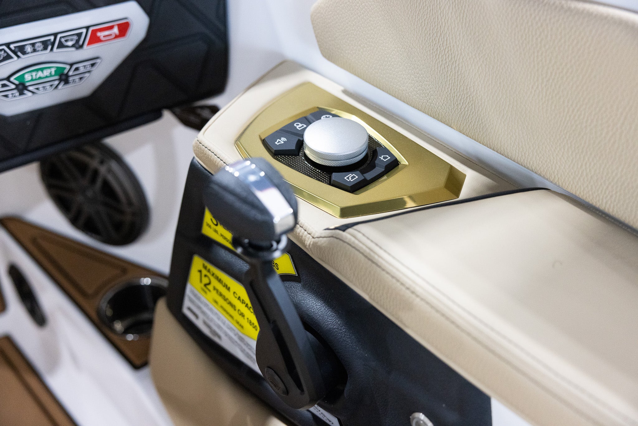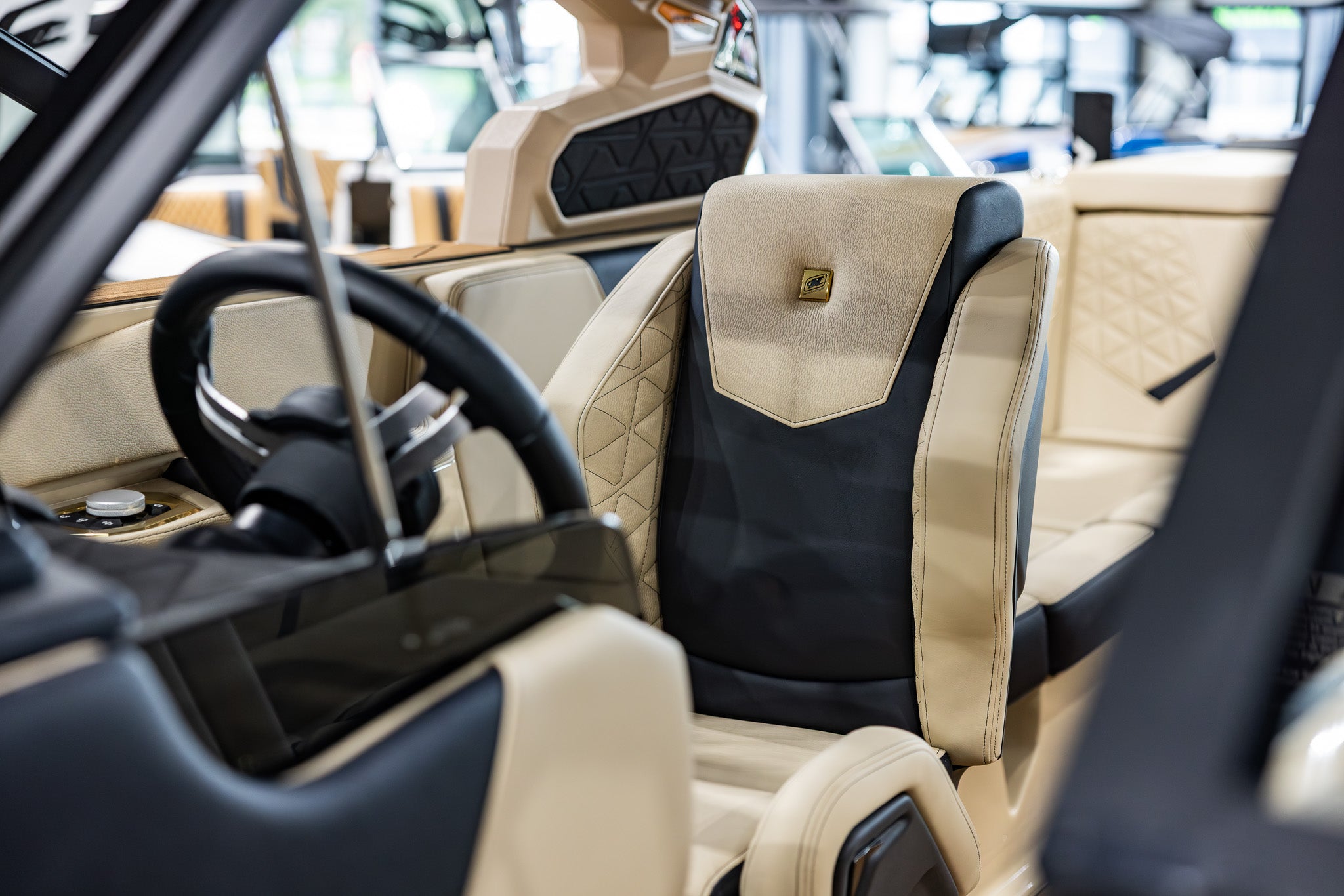 G23 in STUNNING JET BLACK METAL FLAKE with a Gold Chrome Illusion Frost Finish. With a surf wave that can be customized based on the preferences of the surfer, the G23 provides epic waves for every wakeboarder and wakesurfer from beginner all the way to the most seasoned pros. With seating capacity of 16 there is plenty of seating options, flip-up and a reversible stern seat so everyone can sit back and watch all the action.